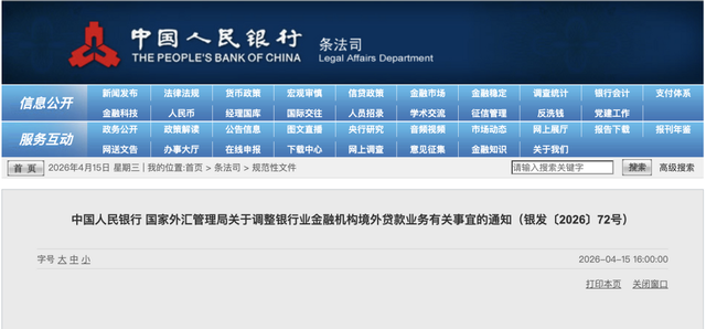 4月15日,中国人民银行与国家外汇管理局近日联合发布《关于调整银行业金融机构境外贷款业务有关事宜的通知》(银发〔2026〕72号),对部分银行的境外贷款杠杆率及间接贷款管理要求作出优化调整。旨在为更好发挥金融服务实体经济、促进贸易投资便利化作用。